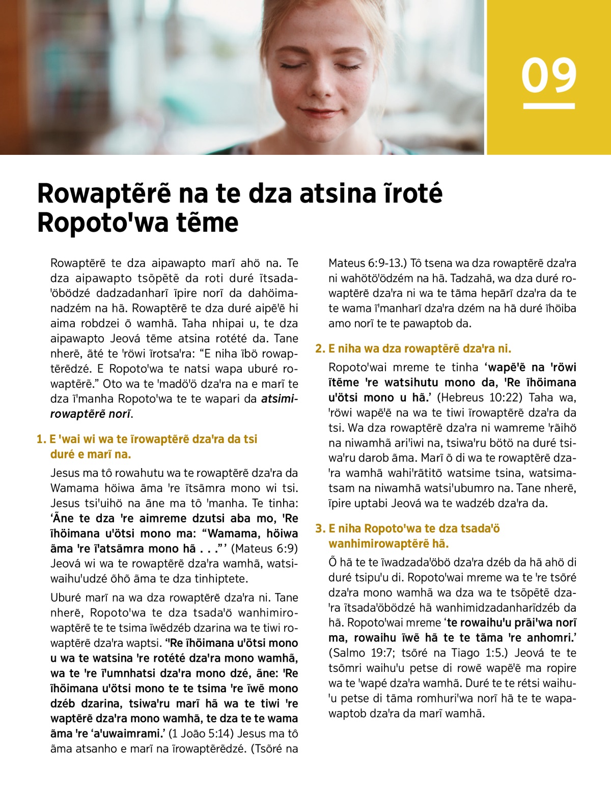 Uburé marĩ na wa dza rowaptẽrẽ dzaꞌra ni. Tane nherẽ, Ropotoꞌwa te dza tsadaꞌö wanhimirowaptẽrẽ te te tsima ĩwẽdzéb dzarina wa te tiwi rowaptẽrẽ dzaꞌra waptsi. ‘ꞌRe ĩhöimana uꞌötsi mono u wa te watsina ꞌre rotété dzaꞌra mono wamhã, wa te ꞌre ĩꞌumnhatsi dzaꞌra mono dzé, ãne: ꞌRe ĩhöimana uꞌötsi mono te te tsima ꞌre ĩwẽ mono dzéb dzarina, tsiwaꞌru marĩ hã wa te tiwi ꞌre waptẽrẽ dzaꞌra mono wamhã, te dza te te wama ãma ꞌre ꞌaꞌuwaimrami.’ (1 João 5:14) Jesus ma tô ãma atsanho e marĩ na ĩrowaptẽrẽdzé. (Tsõré na Mateus 6:9-13.) Tô tsena wa dza rowaptẽrẽ dzaꞌra ni wahötöꞌödzém na hã. Tadzahã, wa dza duré rowaptẽrẽ dzaꞌra ni wa te tãma hepãrĩ dzaꞌra da te te wama ĩꞌmanharĩ dzaꞌra dzém na hã duré ĩhöiba amo norĩ te te pawaptob da.