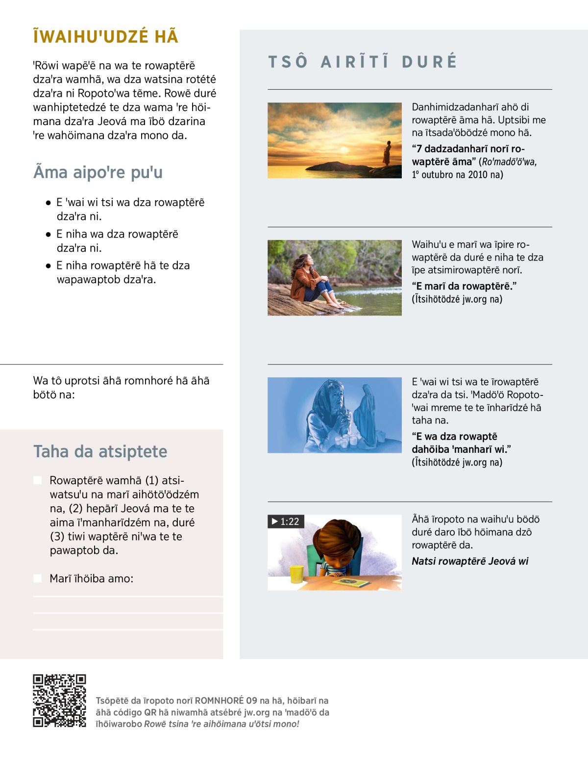 Ropotoꞌwai mreme te tinha ‘wapẽꞌẽ na ꞌröwi ĩtẽme ꞌre watsihutu mono da, ꞌRe ĩhöimana uꞌötsi mono u hã.’ (Hebreus 10:22) Taha wa, ꞌröwi wapẽꞌẽ na wa te tiwi ĩrowaptẽrẽ dzaꞌra da tsi. Wa dza rowaptẽrẽ dzaꞌra ni wamreme ꞌrãihö na niwamhã ariꞌiwi na, tsiwaꞌru bötö na duré tsiwaꞌru darob ãma. Marĩ õ di wa te rowaptẽrẽ dzaꞌra wamhã wahiꞌrãtitõ watsime tsina, watsimatsam na niwamhã watsiꞌubumro na. Tane nherẽ, ĩpire uptabi Jeová wa te wadzéb dzaꞌra da.