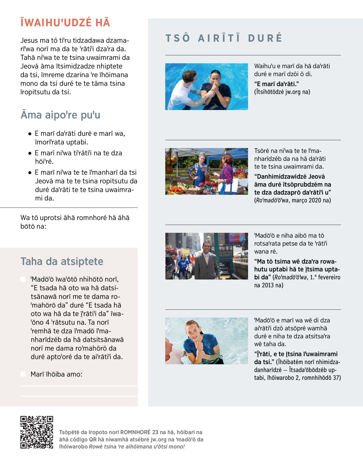 Da te waꞌrãtiꞌi dzaꞌra wamhã, wa dza wahöimana dzaꞌra ni Jeová nhibꞌaꞌuwẽ norĩ me tiꞌai mono bö tsimitsutu ꞌre ĩhöimana dzaꞌra mono hã. Waro duré wahöimanadzé aimawi nherẽ, wa tsadze dzaꞌra ni tô marĩ na hã duré wa tsadawa dzamarĩ dzaꞌra ni tô Ropotoꞌwai nhimiroti hã. Atsiré tsõré aba Provérbios 3:32 duré 1 Pedro 2:17. Taha parimhã atsima robdzanhamri aba ãhã dadzadanharĩ ãma piꞌrebamhã:
