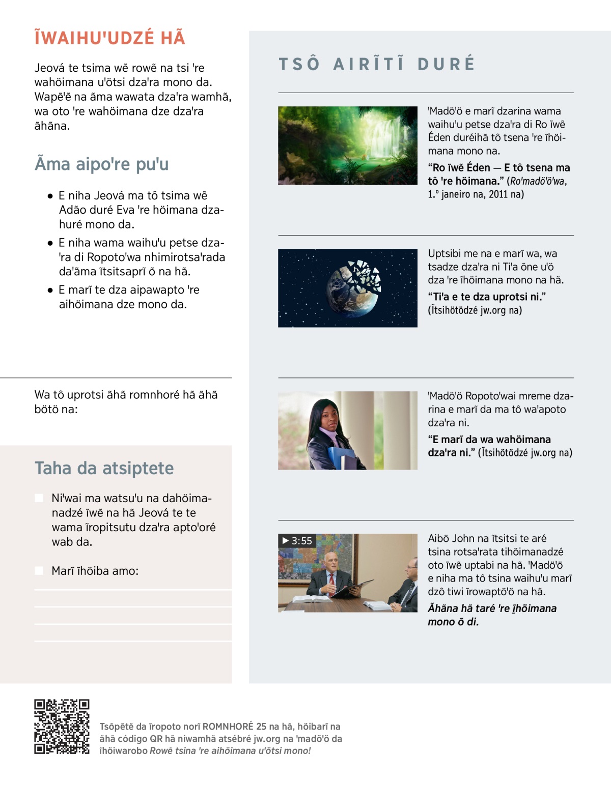 Jeová te tsima wẽ rowẽ na tsi ꞌre wahöimana dzaꞌra mono da. Tiꞌa te te poto wamhã, ma tô titsẽ aibö duré piꞌõ ĩmorĩꞌrata norĩ, Adão duré Eva, Ro ĩwẽ uptabi ꞌremhã Éden na ĩtsitsi. Taha parimhã, ĩwẽ hã te te tãma pitsutu dzahuré tsina te duré ãne tãma nharĩ dzahuré: ‘Te dza atébré aba mo, atsina aihöꞌö aba da hã. Uburé te dza duré tiꞌa hã atsina ĩtsito waꞌwa, atsiptete na atsiwi ꞌre ꞌmadöꞌö aba mono da hã.’ (Gênesis 1:28) Jeová ma tô tsima wẽ ꞌra dzahuré da, Tiꞌai wahuré Ro ĩwẽ na hã te te ꞌmanharĩ dzahuré da, duré abadze norĩ te te ꞌmadöꞌö dzahuré da. Õ hã ma tô tsima wẽ dahödzé ãna, õne uꞌö ꞌre dahöimana dzaꞌra mono da.