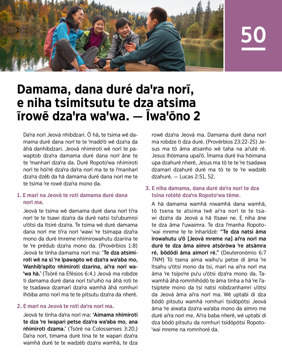 Jeová te tinha daꞌra norĩ ma: ‘Aimama nhimiroti te dza ꞌre ĩwapari petse dzaꞌra waꞌaba mo, ana nhimiroti dzama.’ (Tsõré na Colossenses 3:20.) Daꞌra norĩ, timama duré tina te te wapari dzaꞌra wamhã duré te te wadzéb dzaꞌra wamhã, te dza rowẽ dzaꞌra Jeová ma. Damama duré dana norĩ ma robdze ti dza duré. (Provérbios 23:22-25) Jesus ma tô ãma atsanho wẽ taha na aiꞌuté ré. Jesus ĩhöimana upaiꞌõ. Ĩmama duré ĩna höimana upa dzahuré nherẽ, Jesus ma tô te te ꞌre tsadawa dzamarĩ dzahuré duré ma tô te te ꞌre wadzéb dzahuré. — Lucas 2:51, 52.