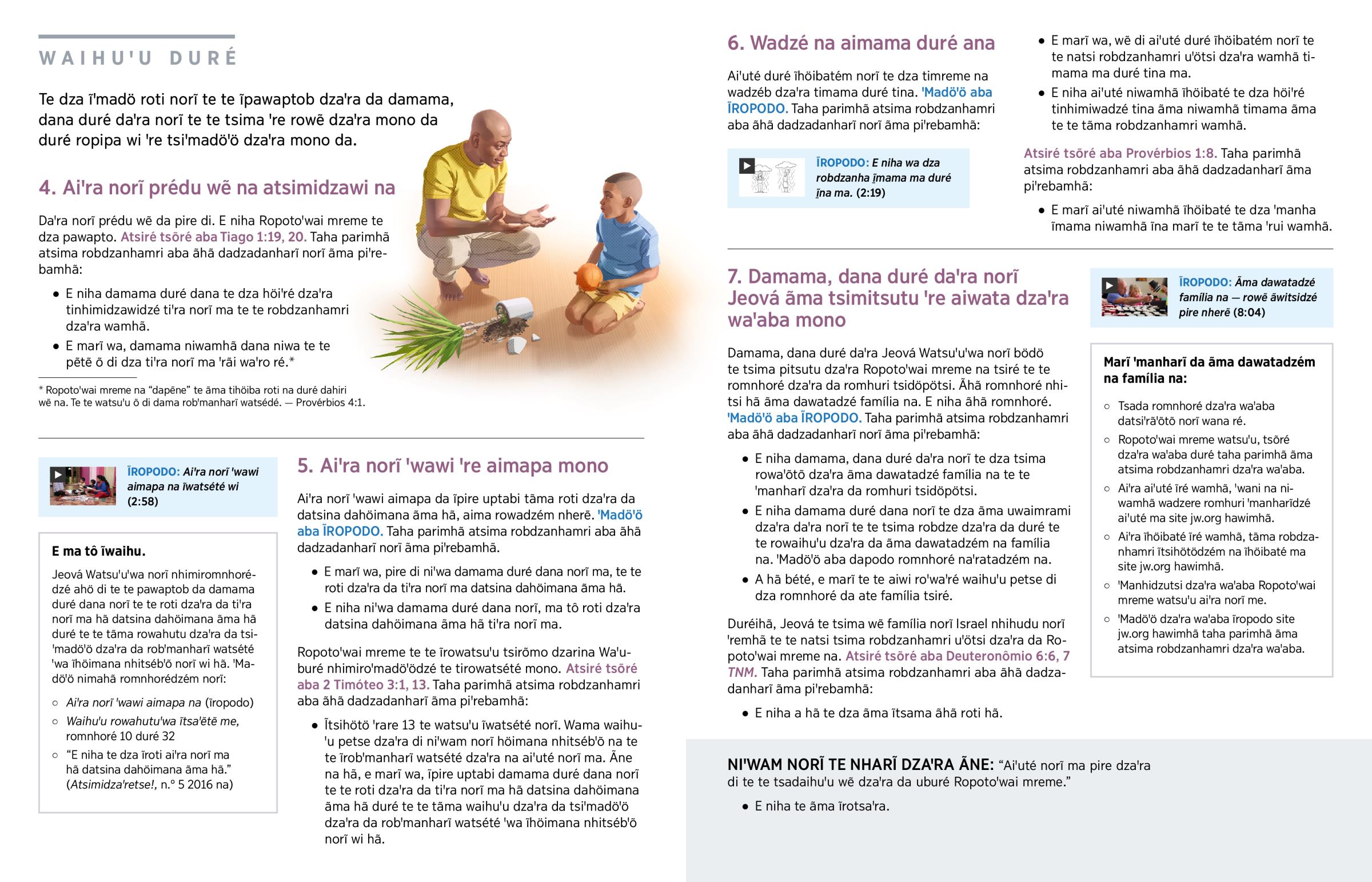 Jeová te tsima wẽ damama duré dana norĩ tiꞌra norĩ te te tsawi dzaꞌra da duré natsi tsiꞌubumroi uꞌötsi da ĩtsiré dzaꞌra. Te tsima wẽ duré damama dana norĩ me tiꞌra norĩ ꞌwawi ꞌre tsimapa dzaꞌra mono da duré ĩmreme nhimirowahutu dzarina te te ꞌre prédub dzaꞌra mono da. (Provérbios 1:8) Jeová te tinha damama norĩ ma: ‘Te dza atsimiroti wẽ na si ꞌre ĩpawapto wẽ dzaꞌra waꞌaba mo, Wanhibꞌapito nhimiroti dzarina, aiꞌra norĩ waꞌwa hã.’ (Tsõré na Efésios 6:4.) Jeová ma robdze ti damama duré dana norĩ tsiꞌuihö na ãhã roti te te tsadawa dzamarĩ dzaꞌra wamhã ãhã romhuri ĩhöiba amo norĩ ma te te pitsutu dzaꞌra da nherẽ.