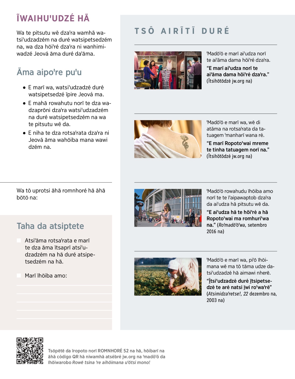 Wa natsi watsiꞌudza dzaꞌra ni ĩwẽ dzarina romhöimanadzé mono bö. Tadzahã, tahã danhipai u ĩpire datsiꞌrãꞌõtõdzéb u watsiꞌabaꞌréi wamhã duré wa te dama roꞌmahörö dzaꞌra wamhã. Wa te watsima wẽ dzaꞌra õ di watsiꞌudzadzéb uꞌöbö da te rotsaꞌrata watsété dzaꞌra da wa te dama ĩroꞌmahörö dzaꞌra mono dzéb ãma. Wa watsima wẽ dzaꞌra ni ꞌre watsiꞌudza dzaꞌra mono da ‘ꞌRe ĩhöimana uꞌötsi mono Waꞌanhoꞌreptuiꞌwa nhimiroti hã da te datsima ꞌre watsuꞌu wẽ dzaꞌra mono da’, niwamhã Jeová ãma da te ꞌre waihuꞌu dzaꞌra mono da. — Tito 2:10.