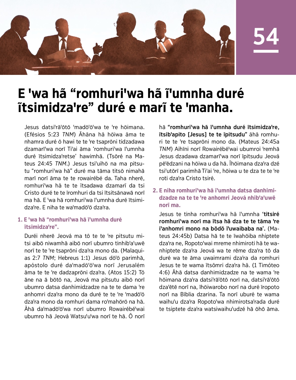 Jesus datsiꞌrãꞌõtõ ꞌmadöꞌöꞌwa te ꞌre höimana. (Efésios 5:23 TNM) Ãhãna hã höiwa ãma te nhamra duré õ hawi te te ꞌre tsaprõni tidzadawa dzamarĩꞌwa norĩ Tiꞌai ãma ‘romhuriꞌwa ĩꞌumnha duré ĩtsimidzaꞌretse’ hawimhã. (Tsõré na Mateus 24:45 TNM.) Jesus tsiꞌuihö na ma pitsutu “romhuriꞌwa hã” duré ma tãma titsõ nimahã marĩ norĩ ãma te te rowairébé da. Taha nherẽ, romhuriꞌwa hã te te ĩtsadawa dzamarĩ da tsi Cristo duré te te ĩromhuri da tsi ĩtsitsãnawã norĩ ma hã. E ꞌwa hã romhuriꞌwa ĩꞌumnha duré ĩtsimidzaꞌre. E niha te waꞌmadöꞌö dzaꞌra.