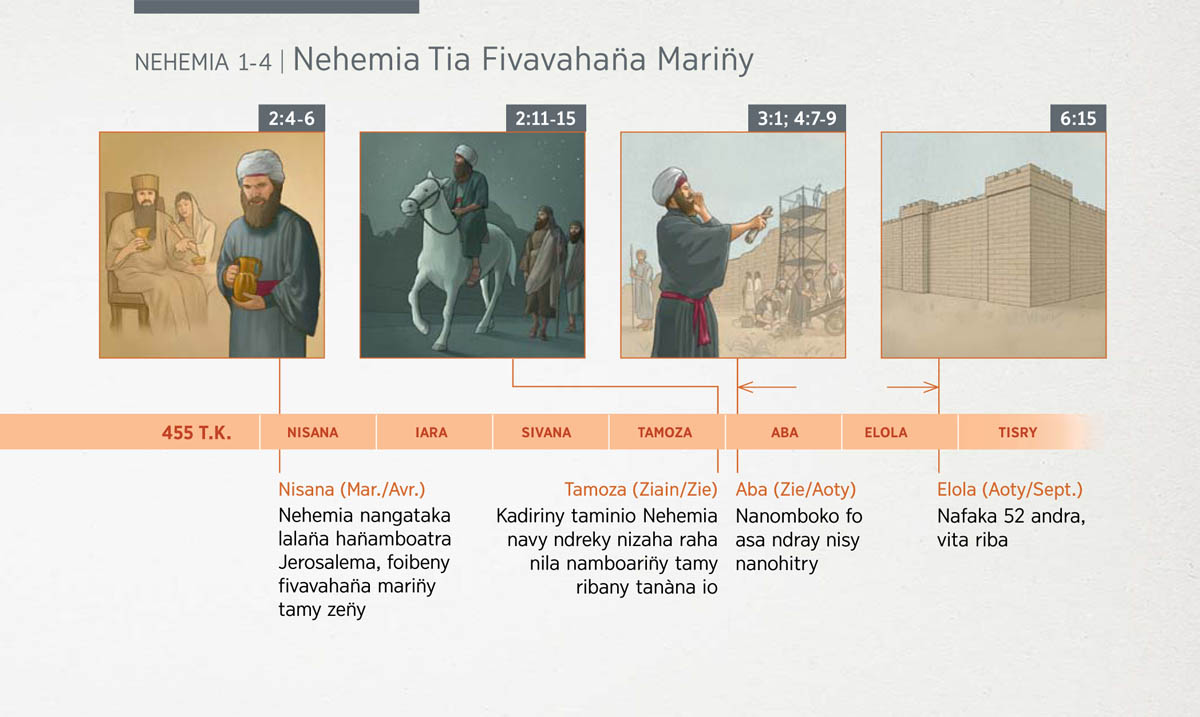 2:4-6 Nehemia nangataka lalan̈a han̈amboatra Jerosalema, foibeny fivavahan̈a marin̈y tamy zen̈y