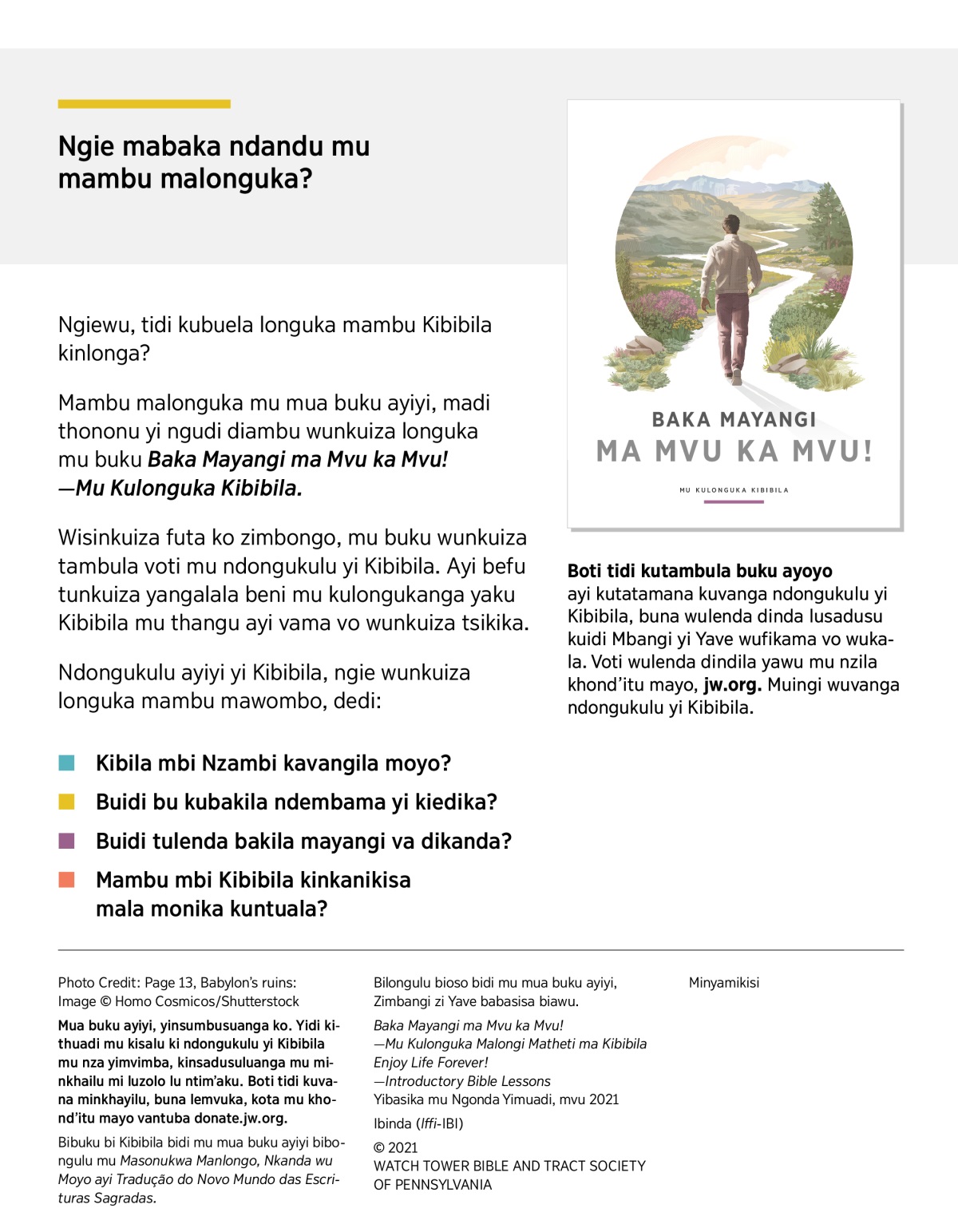 Boti tidi kutambula buku ayoyo ayi kutatamana kuvanga ndongukulu yi Kibibila, buna wulenda dinda lusadusu kuidi Mbangi yi Yave wufikama vo wukala. Voti wulenda dindila yawu mu nzila khond’itu mayo, jw.org. Muingi wuvanga ndongukulu yi Kibibila.