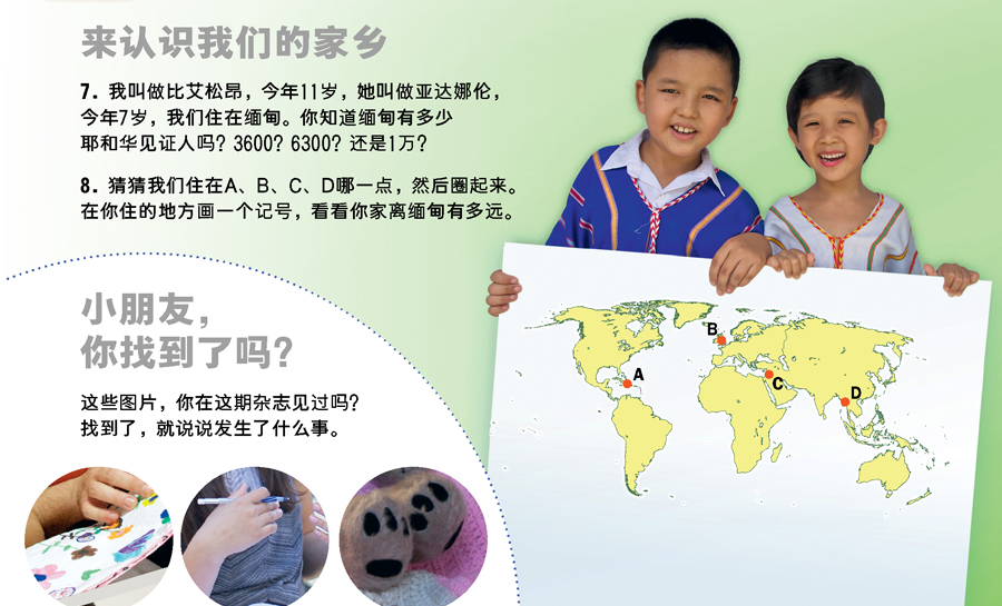 猜猜我们住在A、B、C、D哪一点,然后圈起来。在你住的地方画一个记号,看看你家离缅甸有多远。
