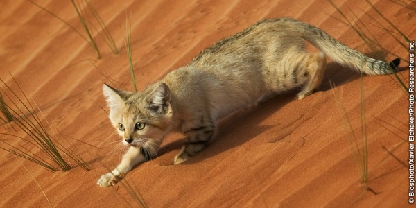 深夜时分,在一个干旱的沙漠中,一只沙丘猫从它的窝里走出来。它站住,一边环顾左右,一边听着四周的动静。然后,它蹲伏下来,一声不响地慢慢往前爬。