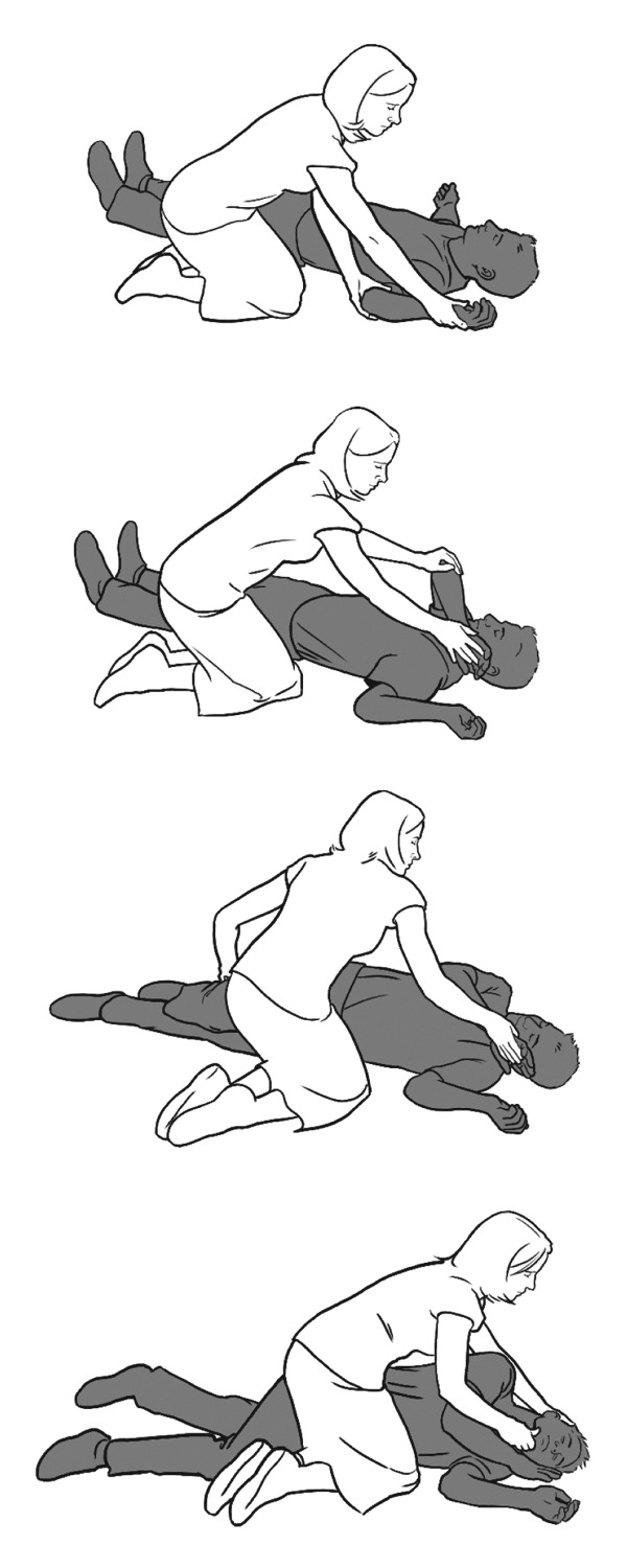 患者癫痫发作时,可以怎样帮助他?可以把一些柔软的东西放在地上垫着他的头,移开他头部周围的硬物、锐器。痉挛停止后,按照附图的方法把患者转向一侧。