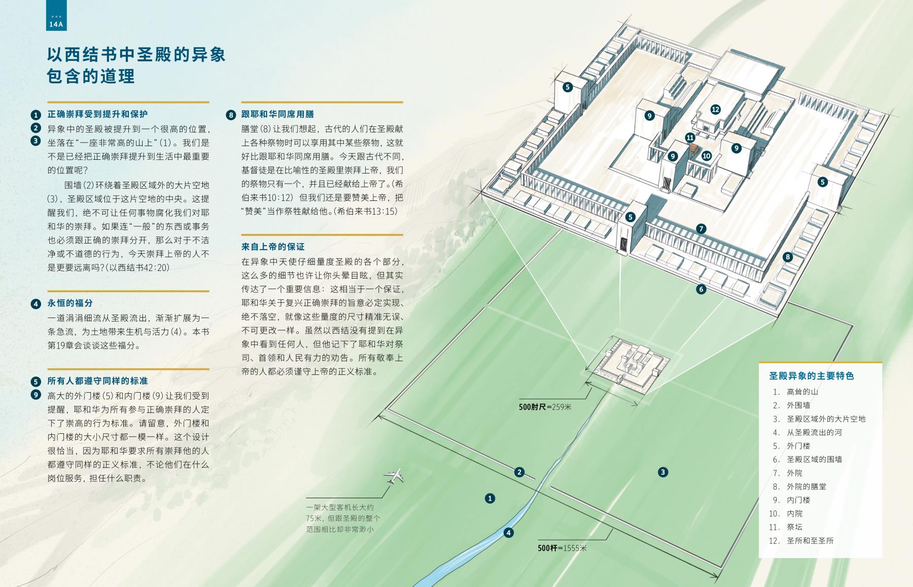 围墙(2)环绕着圣殿区域外的大片空地(3),圣殿区域位于这片空地的中央。这提醒我们,绝不可让任何事物腐化我们对耶和华的崇拜。如果连“一般”的东西或事务也必须跟正确的崇拜分开,那么对于不洁净或不道德的行为,今天崇拜上帝的人不是更要远离吗?(以西结书42:20)