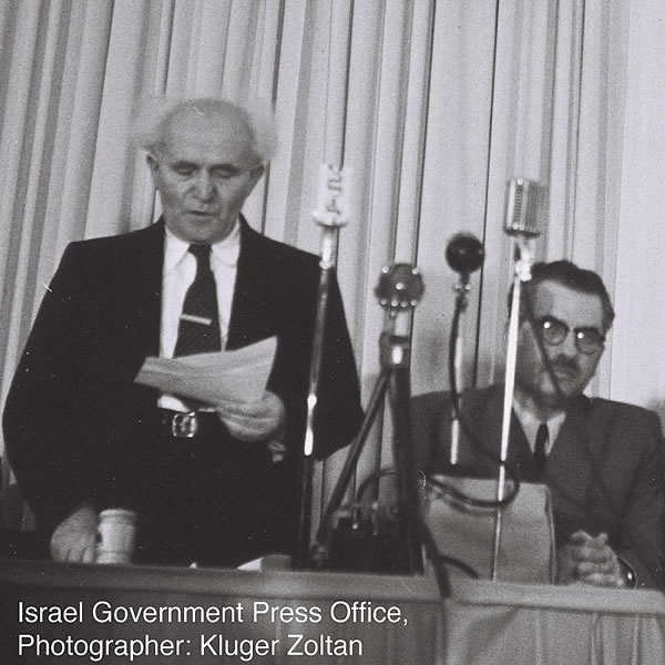 以色列全国委员会领袖戴维·本-古里安宣读《以色列国立国宣言》,以下是宣言的节录:“本委员会的全体成员,代表以色列土地上的犹太民族……根据我们天赋的和历史的权利,根据联合国大会的决议,宣布在以色列的土地上建立一个犹太国家,那就是以色列国。”