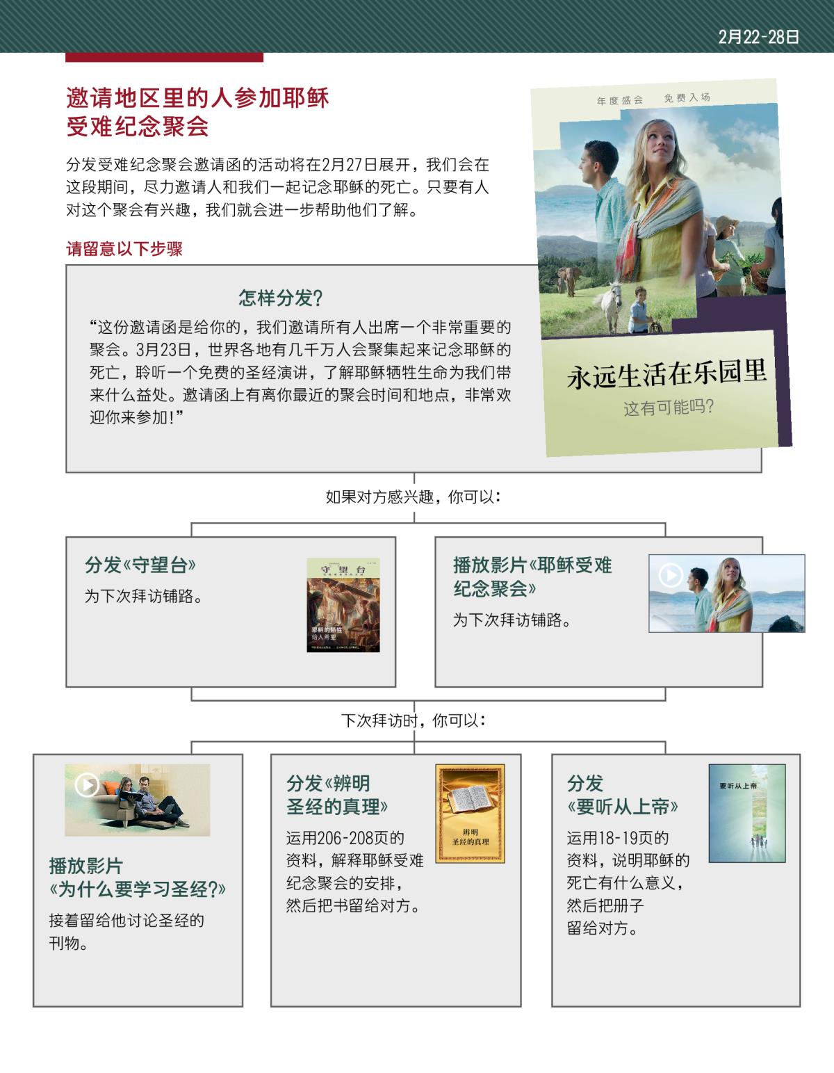 分发受难纪念聚会邀请函的活动将在2月27日展开,我们会在这段期间,尽力邀请人和我们一起记念耶稣的死亡。只要有人对这个聚会有兴趣,我们就会进一步帮助他们了解。