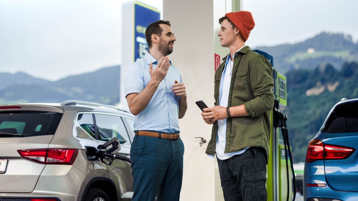 a [图片描述]一个弟兄在加油站以谨慎的方式向一个男子作见证。