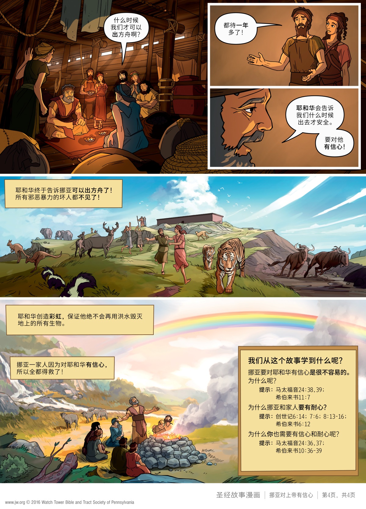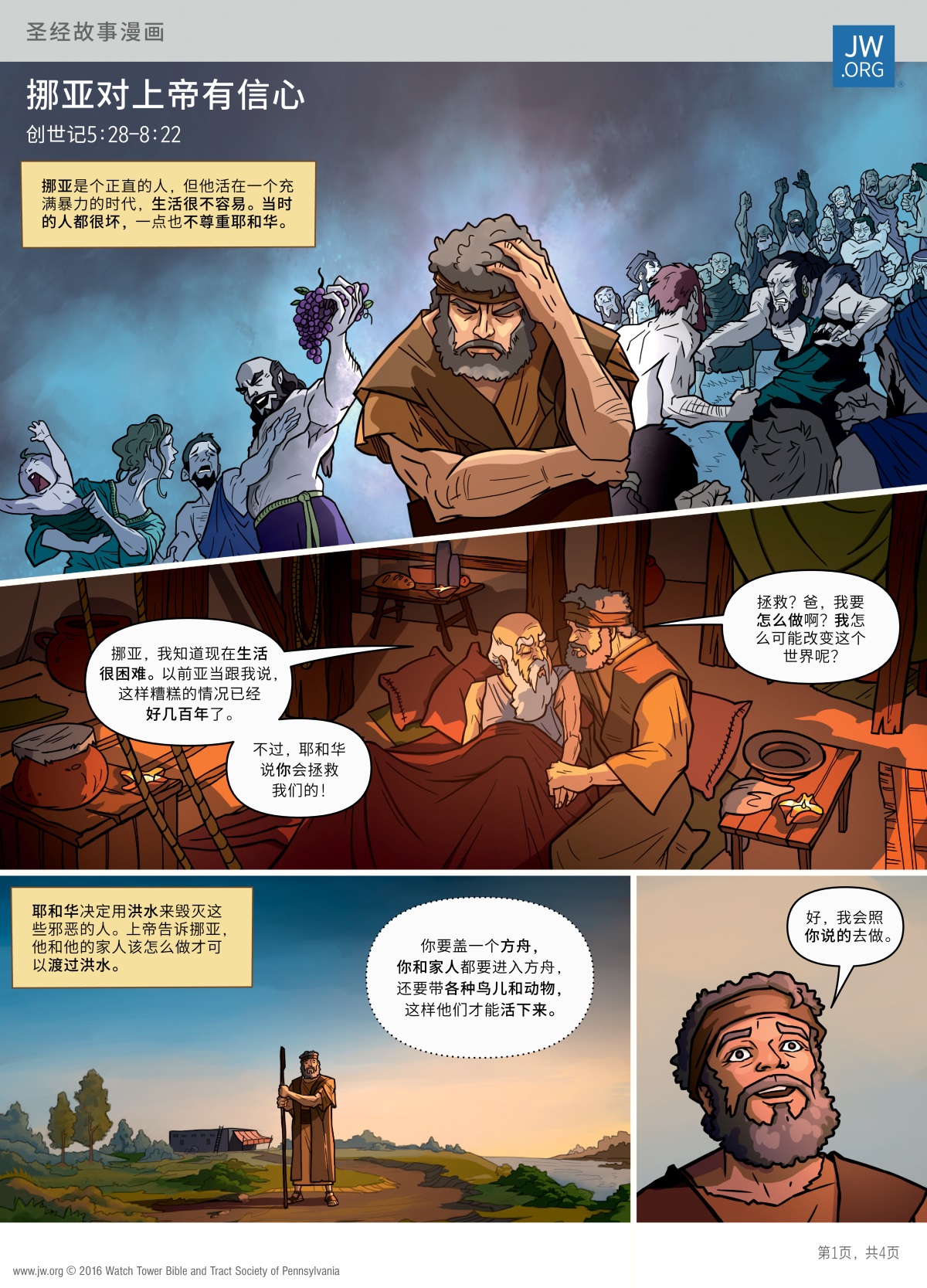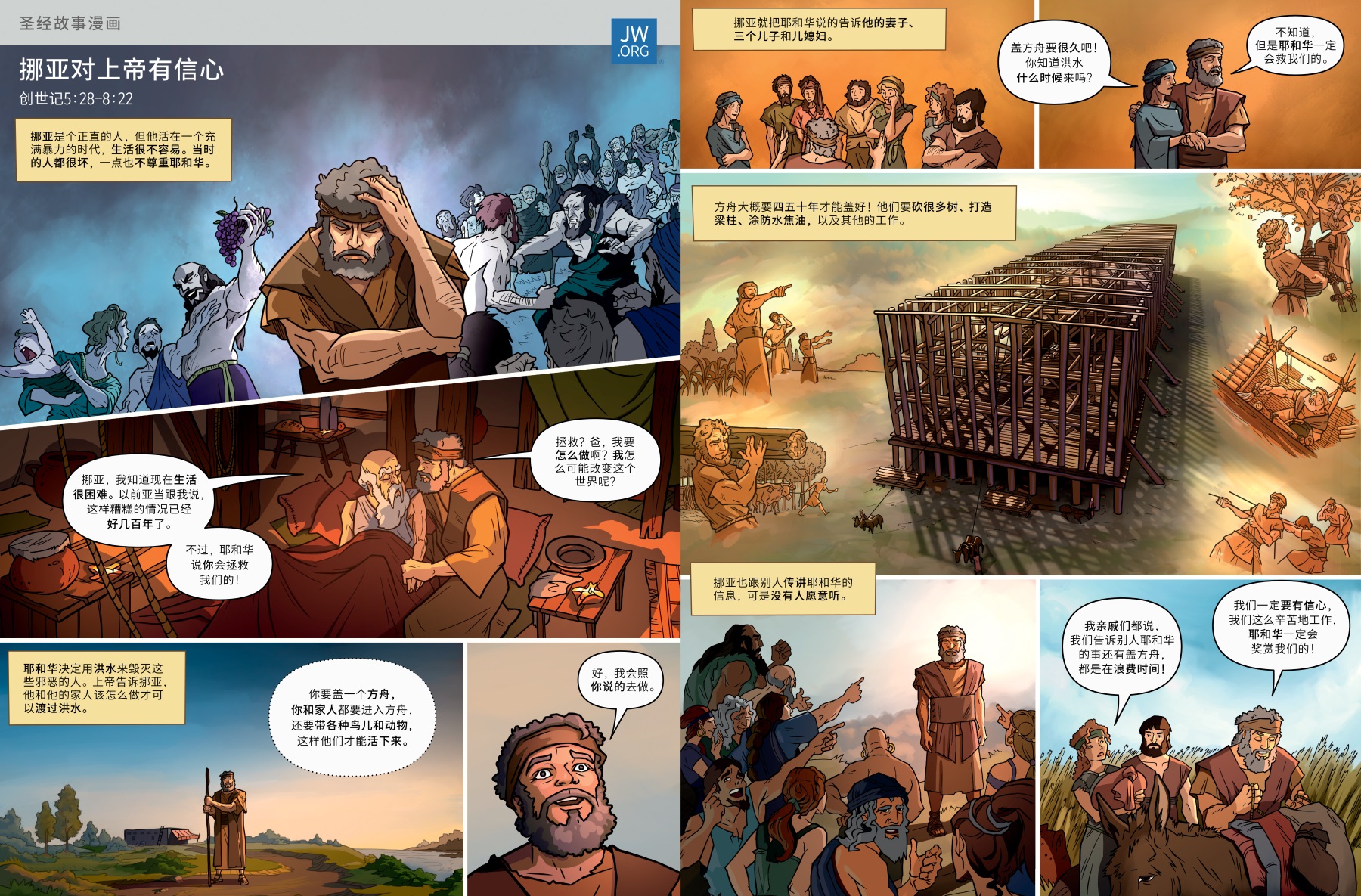 挪亚盖了一个很大的方舟,救了全家人和动物。来看看这个圣经故事漫画多一点了解挪亚。