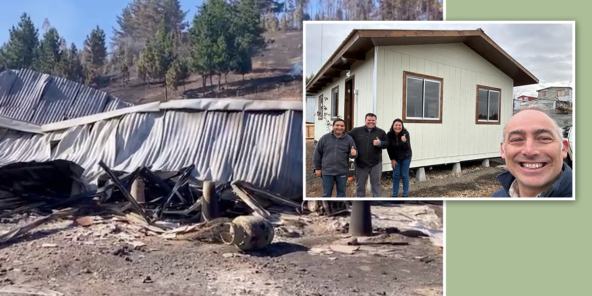 在智利,一个家庭的房屋被烧毁,志愿人员为他们重建房子