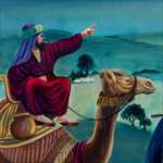 一个人正指着一颗亮晶晶的星,你看见吗?他们离开耶路撒冷的时候,这颗星就出现了。这些人是从东方来的,他们研究天上的星星。他们相信这颗新星正带领他们去见一个重要人物。