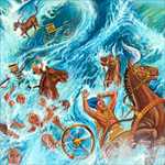 于是,以色列人在海中的干地上走过去。他们几百万人,带着牲畜安全地穿过红海到另一边去,要花好几小时才行。埃及人终于能够看见以色列人。他们的奴隶快要逃跑了!于是,他们急忙冲进海里,要追赶以色列人。