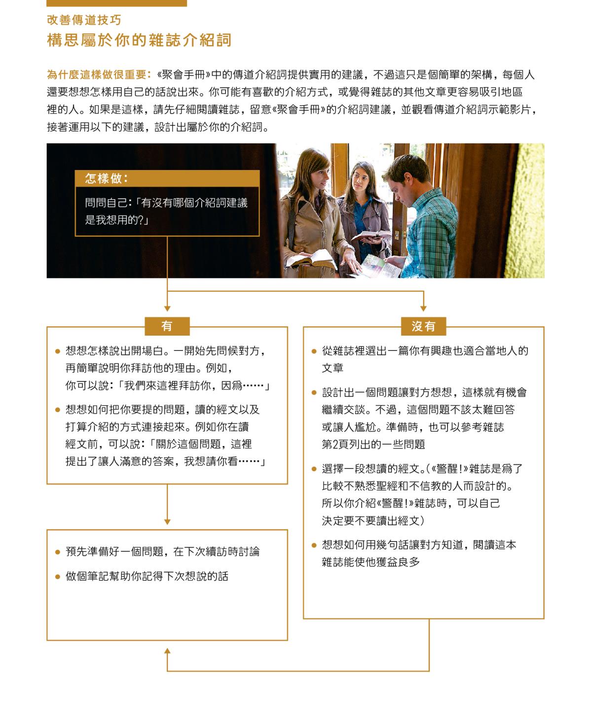 為什麼這樣做很重要:《聚會手冊》中的傳道介紹詞提供實用的建議,不過這只是個簡單的架構,每個人還要想想怎樣用自己的話說出來。你可能有喜歡的介紹方式,或覺得雜誌的其他文章更容易吸引地區裡的人。如果是這樣,請先仔細閱讀雜誌,留意《聚會手冊》的介紹詞建議,並觀看傳道介紹詞示範影片,接著運用以下的建議,設計出屬於你的介紹詞。