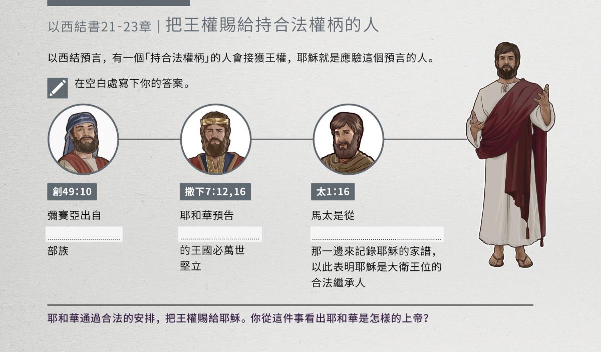 上帝話語的寶藏 | 以西結書21-23章 把王權賜給持合法權柄的人 閱讀印刷版 以西結預言,有一個「持合法權柄」的人會接獲王權,耶穌就是應驗這個預言的人。 創49:10 彌賽亞出自哪個部族? 撒下7:12,16 耶和華預告誰的王國必萬世堅立? 太1:16 馬太是從誰那一邊來記錄耶穌的家譜? 耶和華通過合法的安排,把王權賜給耶穌。你從這件事看出耶和華是怎樣的上帝?