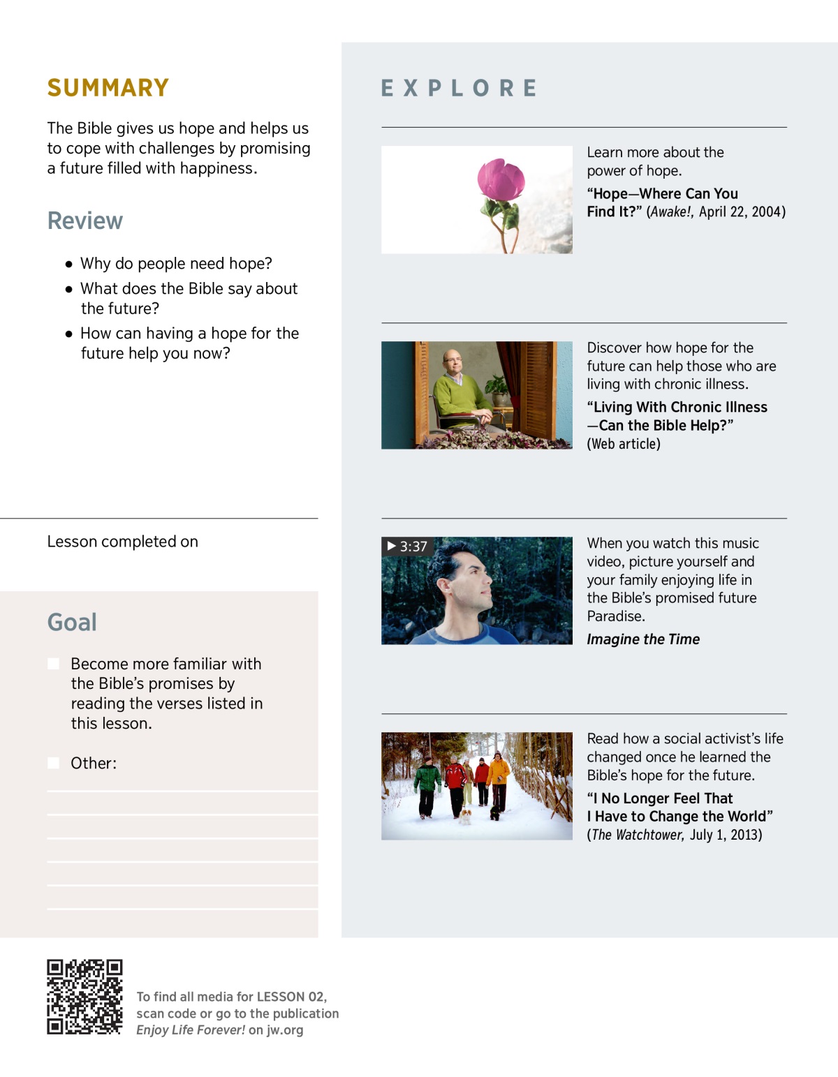 The hope that the Bible offers for the future can help us to battle discouragement and cope with our problems successfully. Read Proverbs 17:22 and Romans 12:12, and then discuss these questions: