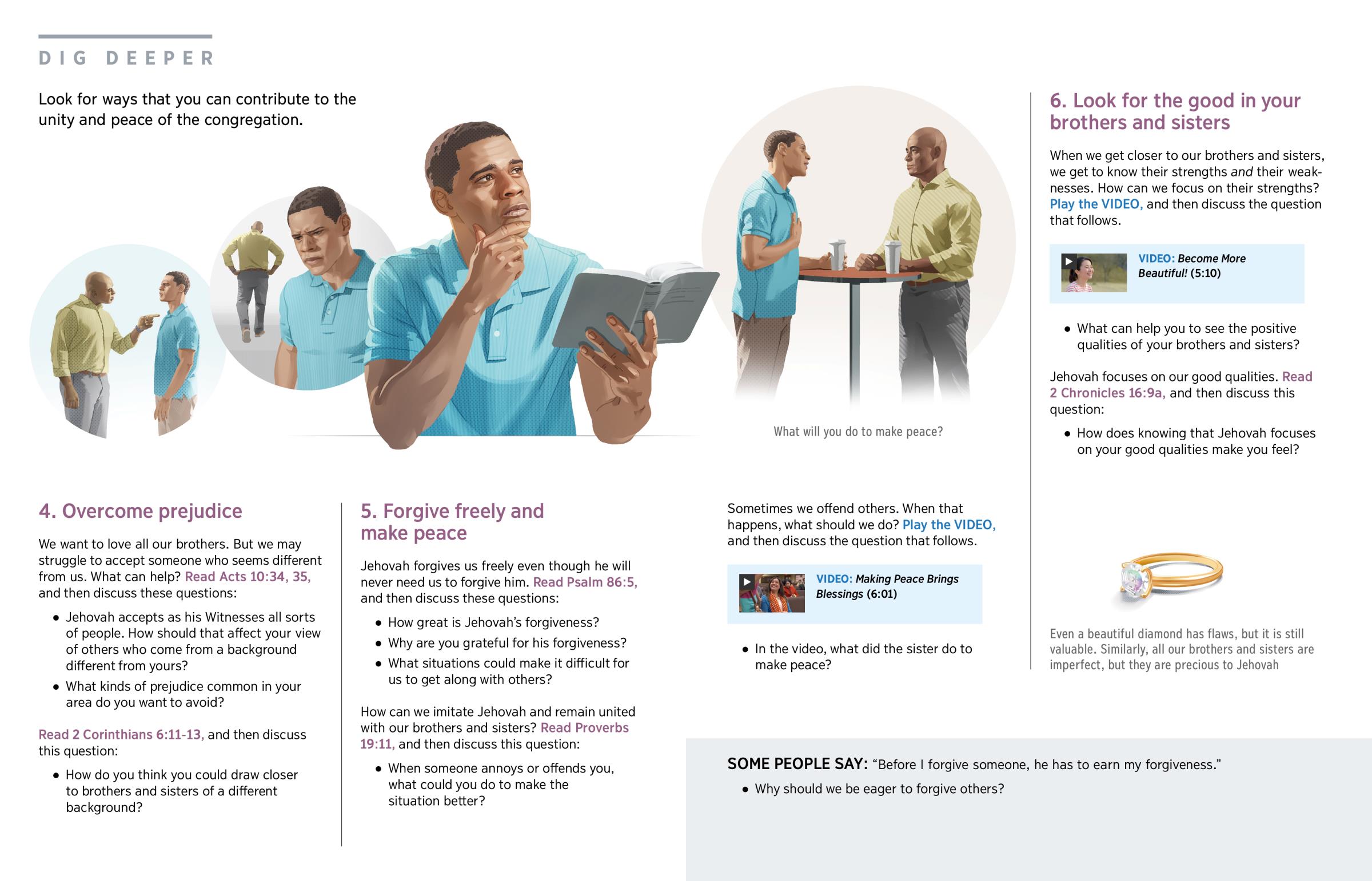 “Love one another intensely from the heart.” (1 Peter 1:22) How can you apply this counsel? Rather than focusing on the imperfections of others, look for their good qualities. Instead of associating with only those who share your interests, try to get to know brothers and sisters who come from different backgrounds. We can also work hard to root out any feelings of prejudice we may have.—Read 1 Peter 2:17.a