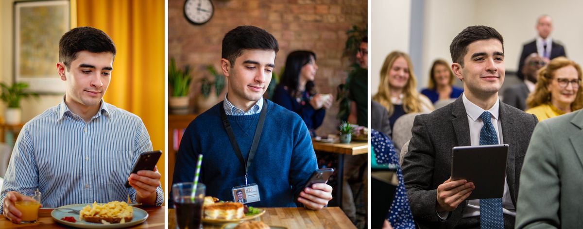 c PICTURE DESCRIPTION: A brother reads the day’s text in the morning, reads the Bible on his lunch break, and attends the midweek meeting in the evening.